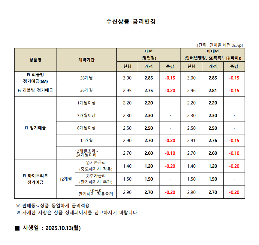수신상품 금리변경 안내 [2025.10.13(월)부터 적용]