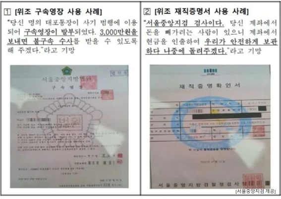 검찰 사칭형의 경우 구속영장, 재직증명서, 채권양도증서, 채무변제확인서, 공무원증 등 위조해 이용하는 경우가 많아 검찰 서류에 익숙하지 않은 일반인 피해가 급증하고 있음으로 꼭 진위 여부를 확인해 주시기 바랍니다.